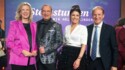 Freuen sich am Ende der Sternstunden-Gala über ein Rekord-Spendenergebnis (v. l.): BR-Intendantin Dr. Katja Wildermuth, Moderator Volker Heißmann, Moderatorin Sandra Rieß, und Thomas Jansing, Vorstandsvorsitzender und Initiator von Sternstunden