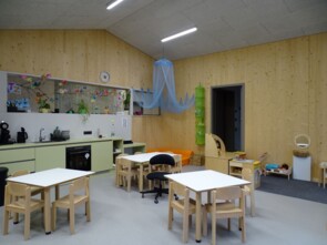Das Gebäude ist als Dorf gestaltet: Durch die Gänge werden die einzelnen Gruppenräume verbunden, die wie eigene Häuser angelegt sind, und demnächst individuelle Einbauten bekommen. Mittelpunkt ist das Bistro und der Mehrzweckraum. Der Neubau wurde barrierefrei und nachhaltig gestaltet mit Holz und begrüntem Dach, Photovoltaik und Wärmepumpe. 10% der Kinder sind als inklusiv geführt.