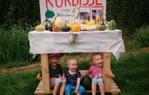 Die drei Geschwister Hanni, Leni und Jakob sammelten mit ihrem selbstgebauten Kürbisstand 403,94 Euro für Kinder in Not. Gegen eine freiwillige Spende konnte man die liebevoll großgezogenen Zierkürbisse mitnehmen.